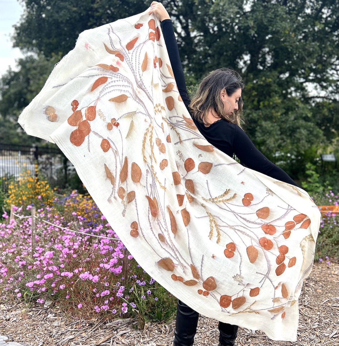 Have you ever seen a stunning flower, vine, mushroom, or leaf in nature and wished you could capture its beauty in cloth, to wear or display at home? Join us for a talk and a demo with fiber artist Mayumi Fujio who lives in the Bay Area creating silk scarves, wall decorations, and art to wear garments using natural dye and real leaves to print their pattern.